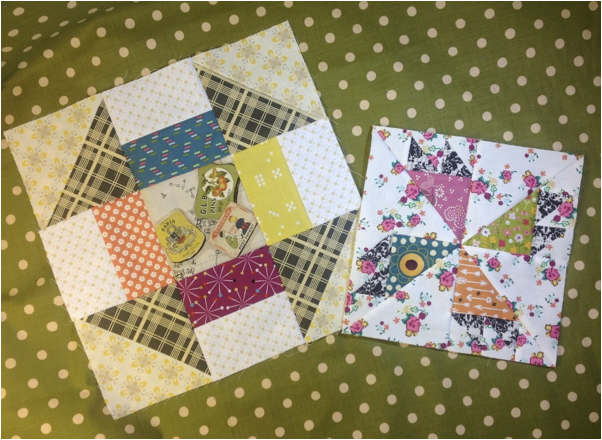 Our first block is a classic churn dash in the picture on the left. You’ve probably made this one before because it’s an easy beginner pattern. I love the fabric Marie carefully cut for the middle (called “fussy cutting”) and the other low volume prints she used for the background.