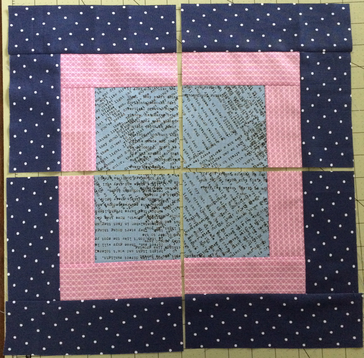 Cut block in half so that the center square is 3.75” on each side. Cut halves into quarters. Trim the quarters along the outside edges to 6.25” square.